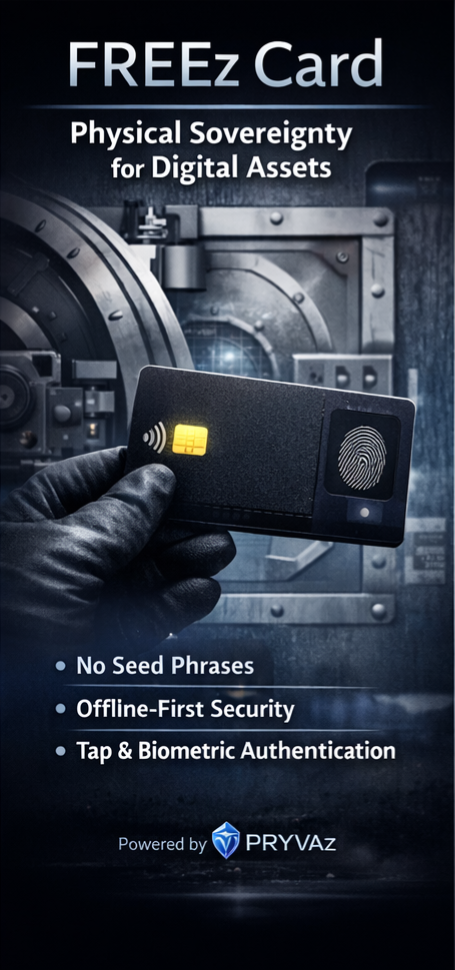 The FREEz Card is a secure, wallet-sized hardware wallet that combines NFC tap-to-authenticate functionality with an integrated on-card fingerprint scanner.