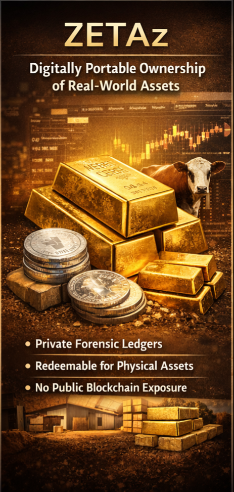 Built on a private, encrypted ledger infrastructure, ZETAz allow users to hold, transfer, trade, or redeem real-world assets digitally without reliance on public blockchains, intermediaries, or fractional-reserve models, combining the stability of tangible assets with the efficiency and portability of digital currency to deliver a privacy-first, asset-backed alternative designed for long-term value preservation and real-world exchange.